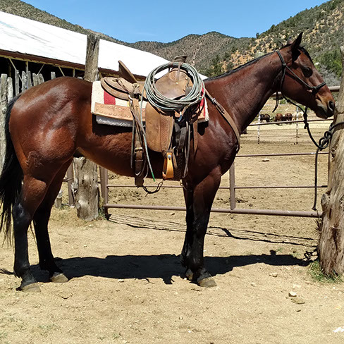 Cadillac just came four this May. He's built nice and is an athletic young horse. He's been cowboyed on all last fall and this spring. He has gathered cattle, been in the shipping corrals, and worked alleys and gates. He will watch a cow and has a really nice handle on him. Cadillac has been roped off of a little. He is watchy on the ground and needs rode consistently, but is getting gentler to be around as he gets used and gets older. He is a good prospect for a rope horse, or just a good ranch horse. Good to shoe, loads really good, and is good with other horses.